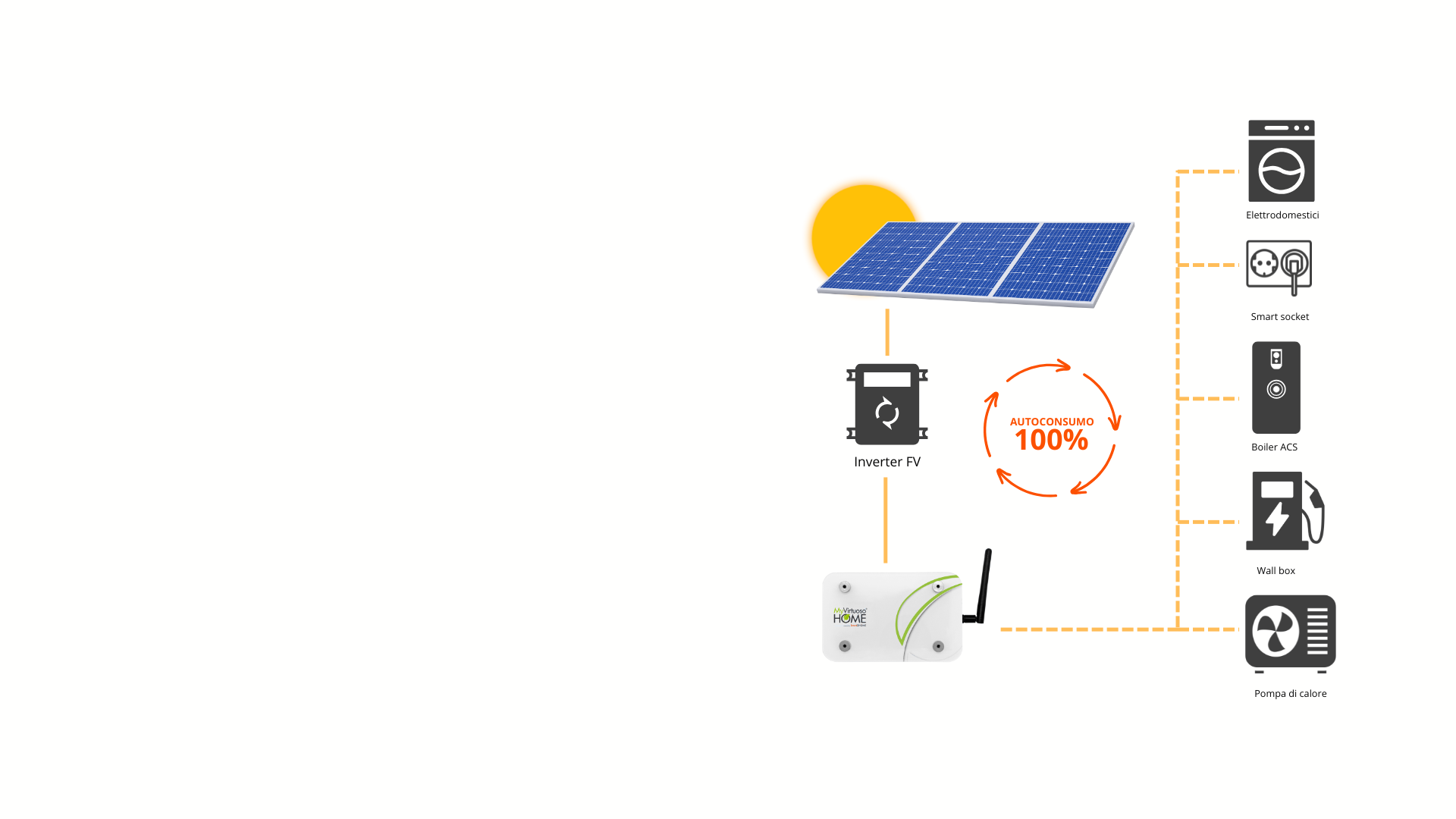 MyVirtuoso Home è specializzato nella gestione dei flussi energetici e, nello specifico, modula impianti come pompe di calore, condizionatori, termoregolazione, in base alla produzione dell'impianto fotovoltaico.